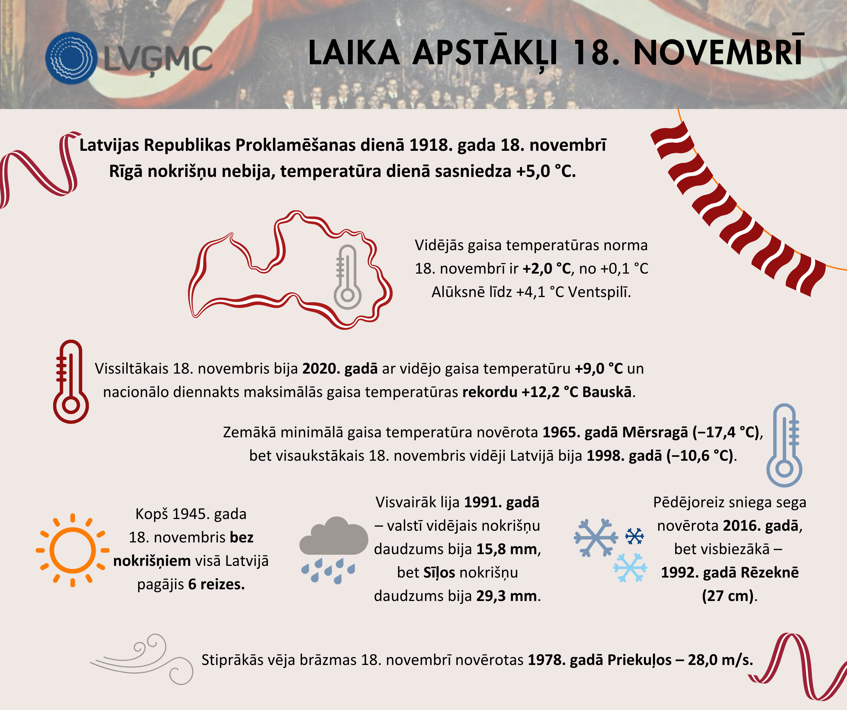 Vēsturiski esam pieredzējuši gan rudenīgi siltus, gan ziemīgi aukstus un sniegotus svētkus. Vissiltākais 18. novembris bija 2020. gadā, kad valstī vidējā diennakts gaisa temperatūra bija +9,0 °C. Todien teju visās novērojumu stacijās uzstādīti jauni diennakts maksimālās gaisa temperatūras rekordi, bet Bauskā uzstādīts Latvijas 18. novembra rekords +12,2 °C.