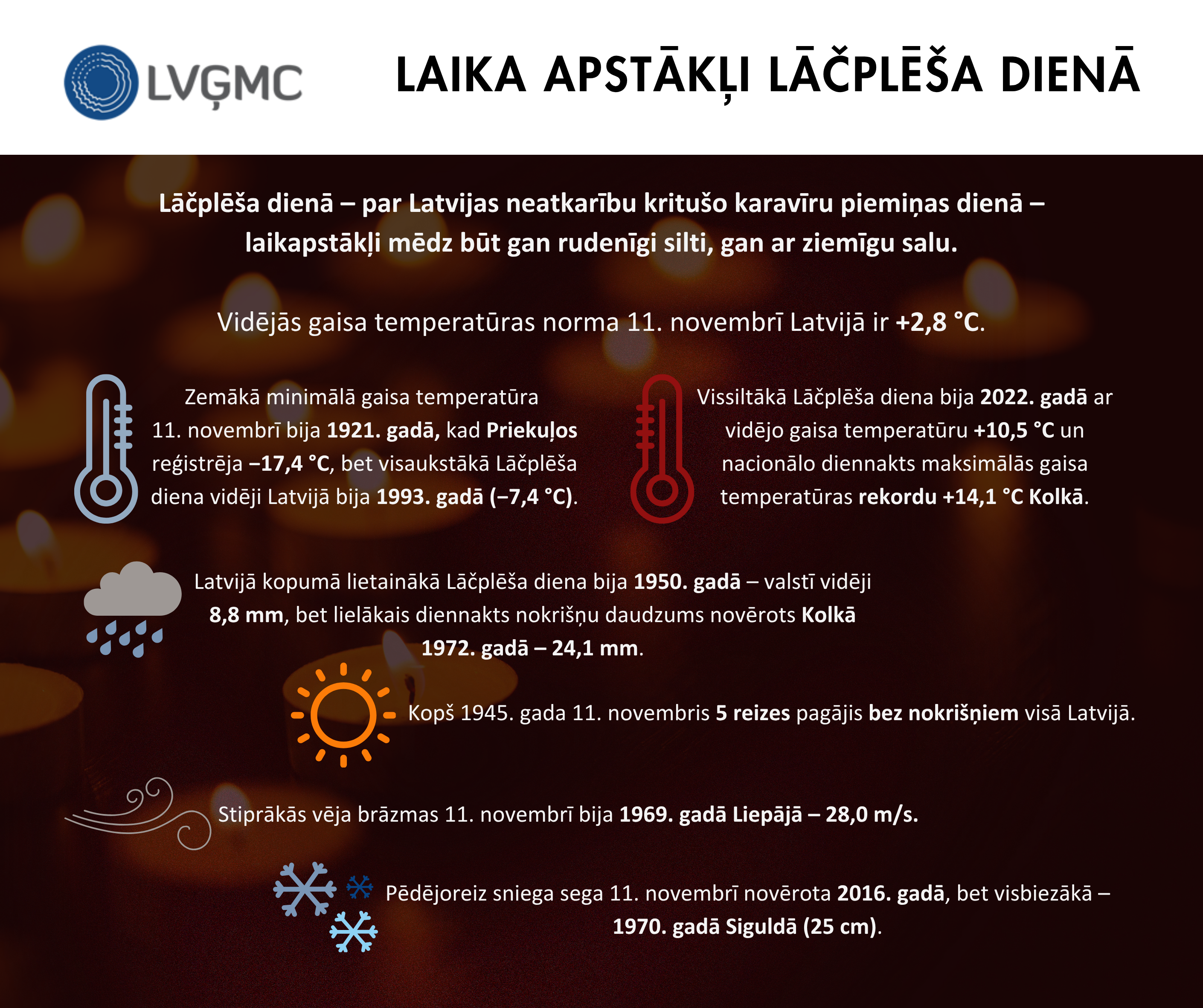 Viszemākā temperatūra 11. novembrī novērota otrajā Lāčplēša dienā 1921. gadā, kad Priekuļos gaisa temperatūra pazeminājās līdz −17,4 °C, bet vidēji Latvijā visaukstākā Lāčplēša diena bija 1993. gadā, kad Latvijas diennakts vidējā gaisa temperatūra bija −7,4 °C.